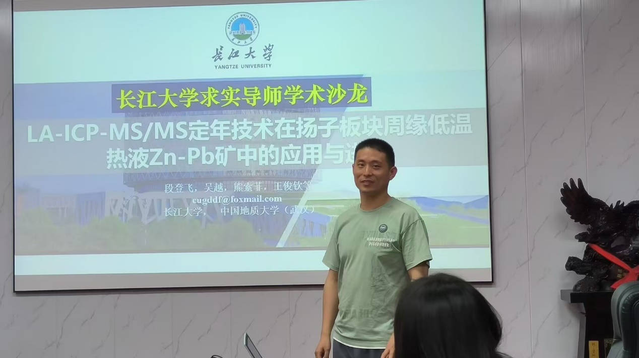 紧接着,段登飞副教授以“LA-ICP-MS/MS定年技术在扬子板块周缘低温热液Zn-Pb矿中的应用与进展”为主题,向大家详细讲解低温热液矿床中定年矿物的选择与LA-ICP-MS/MS定年技术的原理。段登飞副教授提出,低温热液矿床中矿物组合简单,难以找到合适的定年矿物,尤其是Zn-Pb矿床中普遍存在高普通铅干扰,矿床定年难度极大。段副教授逐一剖析传统方法的技术瓶颈,以往使用的古地磁法极容易被构造运动重置年龄,单矿物Rb-Sr等时线法空间分辨率低,误差较大,原位Rb-Sr又面临同质量离子的干扰。而LA-ICP-MS/MS定年技术可有效解决这些问题,双MS技术不仅做到原位微区分析矿物,大大提高了空间分辨率,且独特的离子筛选机制能够有效排除干扰,提升同位素分析精确度,该技术在低温热液Zn-Pb矿床中的绢云母Rb-Sr定年、方解石U-Pb定年、磷灰石U-Pb定年均可以获得较准确的年龄,为破解低温热液矿床定年难题提供了全新技术路径。