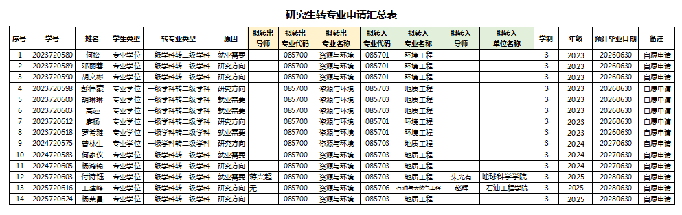 根据《122cc太阳成集团官网研究生学籍管理办法》(长大校发〔2020〕92号)、《关于<122cc太阳成集团官网研究生学籍管理办法>转专业有关条款的补充解释》(研院发〔2024〕5 号)等文件中关于转专业的相关规定,按照工作进程,经员工申请,导师同意,公司审核,现将2025-2026学年第一学期转专业审核结果公示如下,公示时间:2025年9月19日至2025年9月23日。如有异议,请与教学办联系02769111182曾老师。 资源与环境公司 2025.9.19