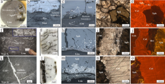 花垣矿田铅锌矿容矿地层为早寒武清虚洞组礁灰岩(~512-510 Ma),不同矿床矿石类型基本一致,主要有:①似层状矿体,硫化物填充于灰岩平底晶洞、窗格构造等中,分为孤立状(图2a-e)和稍晚的连通状(图2f-j)两种;②脉状矿体,硫化物穿插容矿围岩(图2k-o)。本次研究选取上述不同类型矿石中与闪锌矿密切共生的方解石作为研究对象。