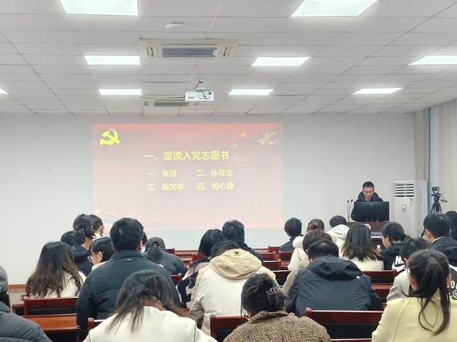 首先是接收预备党员,由4名发展对象依次宣读《入党志愿书》,并向大会汇报对党的认识、入党动机、个人情况以及需要向党组织说明的问题。各发展对象入党介绍人对发展对象的情况加以说明,并对其能否入党表明意见。经支部一致讨论,同意接收李冠等4名发展对象为中共预备党员。