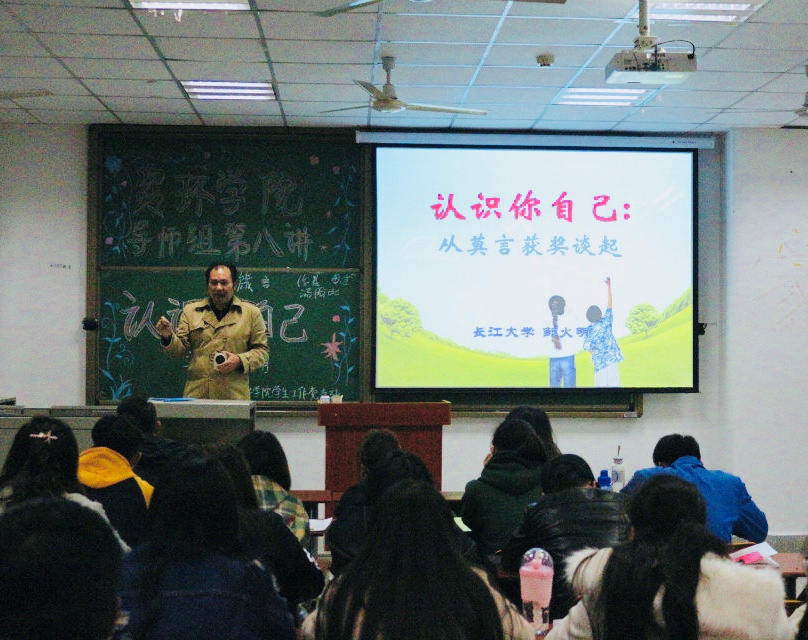 讲座中,邹教授从莫言的获奖讲起,与我们畅谈要从哪几个方面去深入了解你自己。“只有认识你自己,才能更好地融入社会,社会化是我们人类的必然选择。”邹教授告诉我们,“从公开区到盲点区,我们对自己总会有可以认知或潜在认知的领域,我们要学会认识自己,让他人认识自己,我们才能不断成长。