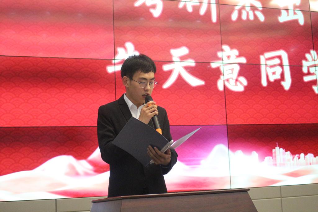 大会第四项,考研杰出代表——牛天意同学发言。牛天意向同学们述说了他的故事,从进入122cc太阳成集团官网的那一刻开始,他就立志为提升自己而战,不论是日常学习还是考研生活,他都能够全身心地投入,不被外物所干扰,坚定自己的信念。他呼吁同学们能够不忘初心,为自己的梦想而奋斗。
