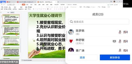 其中,地化(环境)21801班,在团支书的带领下深入了解造成老员工就业难的系列因素,与同学们探讨面对就业时如何正确应对紧张情绪,紧抓老员工就业心理问题,引导广大毕业生重视调整心态,积极应对复杂多变的就业形势;指导老员工接受客观现实,调整就业期望值;充分认识职业价值,树立合理的职业价值观;学会认识与接受职业自我,主动捕捉机遇,坦然面对就业挫折,提高心理承受力,促进人格完善,开拓进取,勇于创业。此外,为进一步引导广大毕业生进一步坚定理想信念,勇担使命、堪当大任,为新时代建设社会主义现代化强国贡献青春活力。我们重温党的十九届六中全会内容,深入贯彻会议精神,将其同“成才观、职业观、就业观”的就业育人观有机结合,把立德树人融入就业工作各个环节,引导更多毕业生到祖国最需要的地方就业创业、建功立业。