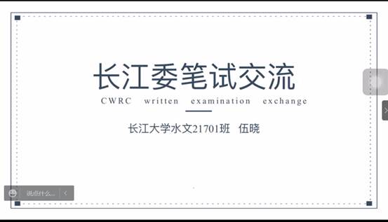 会议中,伍晓学姐首先给同学们介绍了长江水利委员会是公益一类事业单位,接着说明了长江水利委员会水文局的组成以及在各地区的分布,然后提出考试要求及考试内容,最后伍晓学姐分享了自己的复习经验,对于同学们提出的疑问,伍晓学姐进行了详细的解答解决了同学们的疑惑。