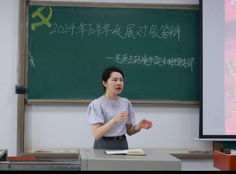 八位候选人依次上台答辩,分别从自我介绍、入党动机、对党的认识、自身不足与改进办法、未来规划等方面阐述。以谈星星同学为代表讲述了她自身经历,在家乡红色文化的熏陶下,崇尚党,敬畏党,渴望加入党组织,表明自己愿意为党事业奋斗的决心。她提到在担任班导期间,陪伴大一同学早晚自习,认真落实他们的英语学习,所带的班级四级通过率达到93%,同时她也密切关注同学们的日常生活,为同学们答疑解惑,她认为班导的经历既充实自己的老员工活也给她带来满满的成就感。