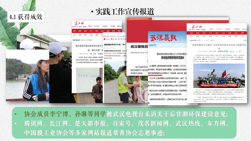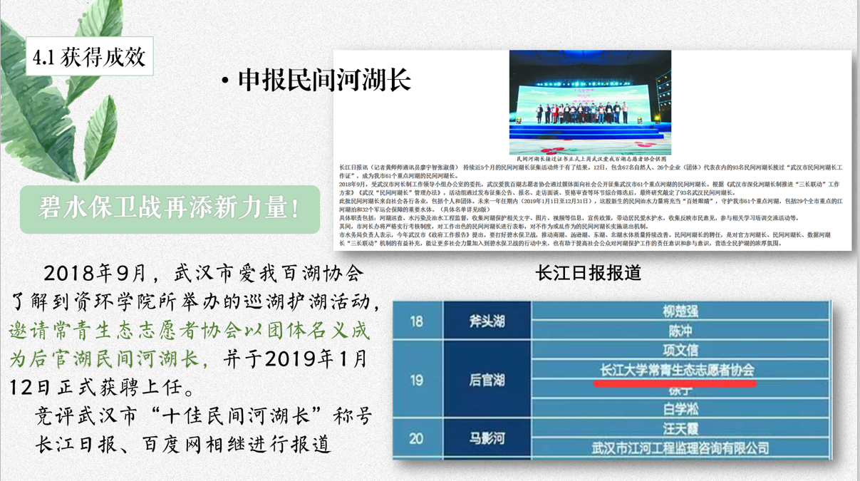 公司常青生态志愿者协会从最初的组织运营再到获得省铜奖,五年的时间里,就取得了质的飞跃,这得益于常青生态志愿者协会的老师以及志愿者们不曾间断的组织青年员工深入乡村开展志愿活动,自2019年至2020年连续两年担任武汉市蔡甸区后官湖民间河湖长。服务内容以每月进行的巡湖测水质活动为基础,组织各类创新环保志愿活动模式,坚持走乡村绿色发展之路;定期开展的环保演讲活动,是口才与志愿服务的相碰,撞出多元的环保理念;暑期三下乡活动,引导了广大青年员工聚焦实施乡村振兴战略,将环保志愿精神传递至乡村,发扬至社会;废物利用活动、志愿家教等活动也激发了不少同学投身环保志愿活动的积极性。
