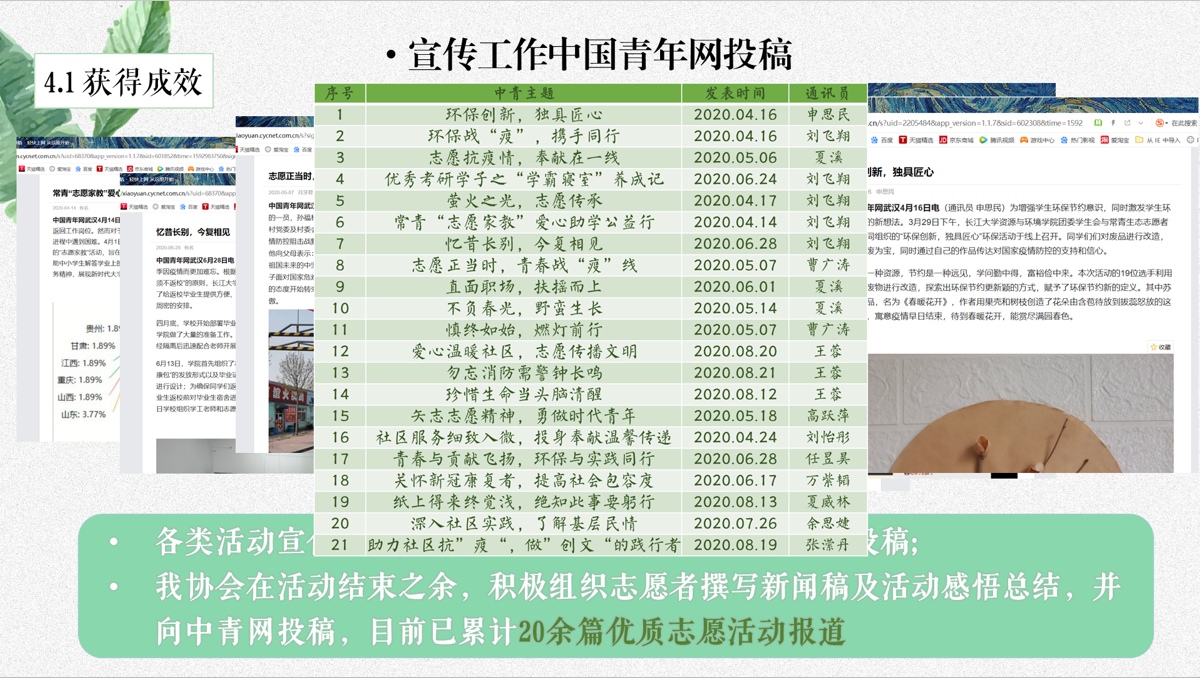 常青生态志愿者协会为了加大宣传力度将活动开展取得的效果发挥到最大,协会内部专门建立中青校园通讯社,不到一年的时间里就已经累计20余篇优质志愿活动报道,这得益于广大的有志青年不断在中青校园上投稿。他们将协会每一次举办的活动以及获得的优异成绩展现在中青校园广大高校平台上,每一篇文章都有一个特有的故事,在中青校园中讲好社会好实践,讲好公司好故事,传播协会好文化!
