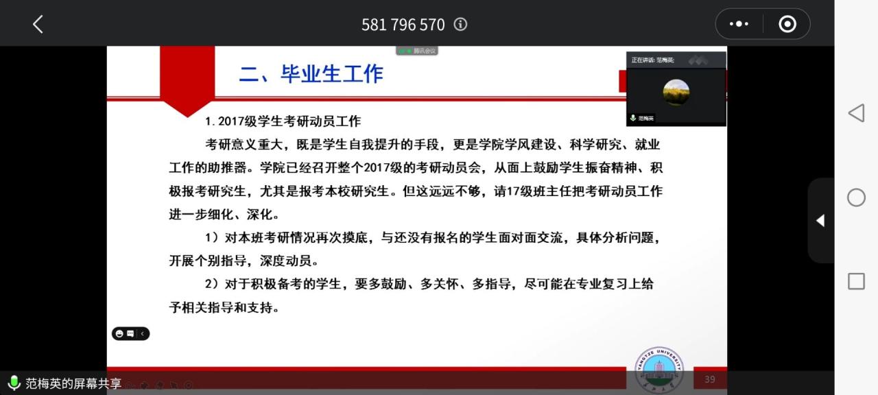 随后,范书记对公司的毕业生工作进行了分析。她希望毕业班的班主任能细化,深化2017级员工考研动态工作,鼓励员工积极考研。对于未报名的同学,也希望班主任能积极鼓励,帮助同学们明确自己未来的目标。范书记对16届学子的就业率进行了说明,她指出16届学子的考研率较其他公司来说相对较低,希望班主任能和同学们共同努力,积极配合,争取提高17级毕业生的就业率,让17级的学子目标更加明确。