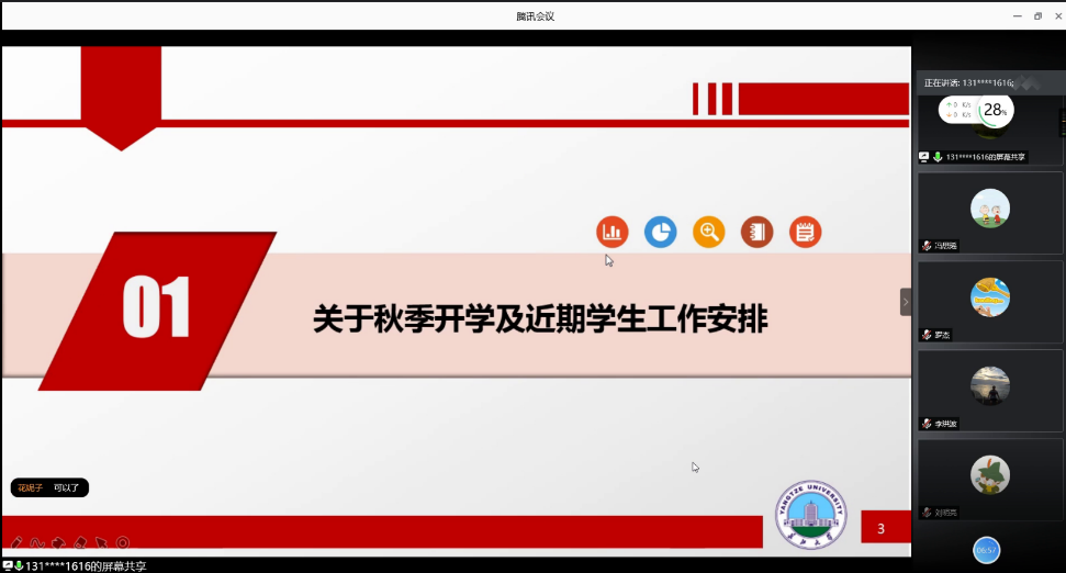 (通讯员 刘思雨/图 李婉婷/文)全国上下万众一心,共同抗击疫情数月后,各地疫情基本已经得到控制,我们也终于看到了胜利的曙光。8月21日下午3点,122cc太阳成集团官网太阳成集团tyc122cc于线上腾讯会议进行了一场班主任会,本次会议主要是关于秋季开学及近期员工的工作安排。本次会议由范梅英书记主持,所有班主任老师出席本次会议。本次会议的目的主要是讲述如何利用开学前的这一段时间,严防死守、群控群防,确保各项防控措施得到落实,扎实做好春季开学各项疫情防控准备工作。