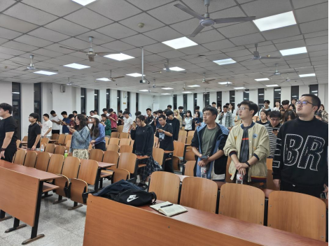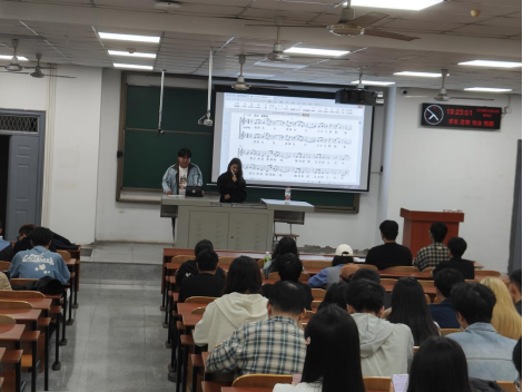 活动伊始,黄鹏老师指出,校歌是公司精神文化的生动载体,希望研究生同学们在科研探索之余,也能在歌声中加深对公司历史与底蕴的理解,凝聚奋进力量。教学环节由两位本科同学领衔,他们采用“一句一跟唱”的互动模式,耐心示范每一句的旋律与节奏。经过数轮反复练习,同学们的演唱从最初的参差不齐逐渐变得整齐划一,歌声也愈发自信洪亮。整个教室沉浸在激昂的旋律中,校歌所承载的精神内涵在声声传唱中深入每一位学子的内心。