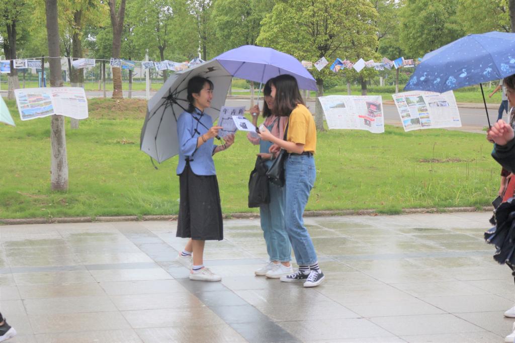来到主干道,可见作品已被一一摆出进行展览。着民国服饰的工作人员正在向过路同学宣传五四精神,并通过发放“旧报纸”宣传单等方式促进路过同学们对五四运动的进一步认识,同时对他们进行随机采访,收集他们的志愿经验及对五四精神的理解。对前来了解活动的同学,工作人员提供五四爱国贴纸并动员他们参与现场绘画。