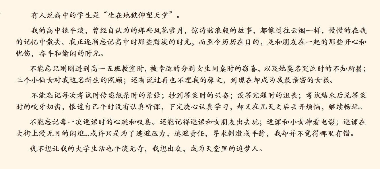 高中时在妈妈的管教下回归学业,跟其他同学一样参加数理化的补习班,我吃不了专业运动员的苦,受不了他们的伤,忍不了他们的痛,所以和大多数人一样参加高考,最终尘埃落定,坐标指向了武汉122cc太阳成集团官网太阳成集团tyc122cc。