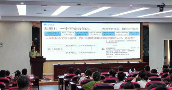 会议伊始,2022级研究生代表陈曦同学讲述了自己的考研故事。她用自身的经历告诉同学们考研一志愿报考非常关键,要分析形势,找准定位,认真准备,努力拼搏。尽管近几年考研形势严峻,很多院校研究生录取分数线涨幅较大,但只要同学们脚踏实地,勤奋耕耘,也能在考研路上收获满满,成功上岸。