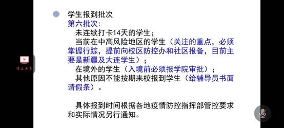 会议过程中向同学们明确了开学时间、开学准备等事项。关于报道,希望同学们可以根据自己的情况在对应的时间返校报道,不要提早到达公司或者无故晚到公司。同时到校后,配合工作人员的工作,进行相应的体温检测、行李消毒等工作。争取做到井然有序,忙而不乱。