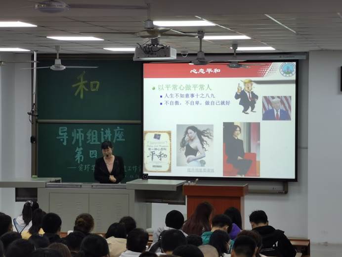 在讲座过程中,赵经理以四级考试来举例子,这次四级没过,就努力争取下次过,然后提出保持身心健康,就需要我们在做任何事情的时候要做最坏的打算。其次还讲到低调做人,高调做事,心态放平和,自我定位清晰,我们是普通人,所以要以平常心做平常事,对自己不满意,大多是没达到自己的目标,应给自己树立合理的预期。赵经理展示了几张图片,并表示当今大部分年轻人还是以颜值当道,但给同学们强调了提升颜值要谨慎,以最早的网红芙蓉为例子,用七、八年的时间慢慢平和,改造自己,气质有了跃迁。之后通过集体互动的形式,进行了一个心理测评,同学们都很积极配合。