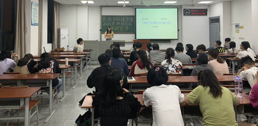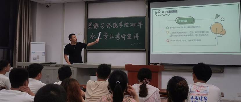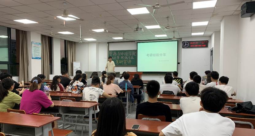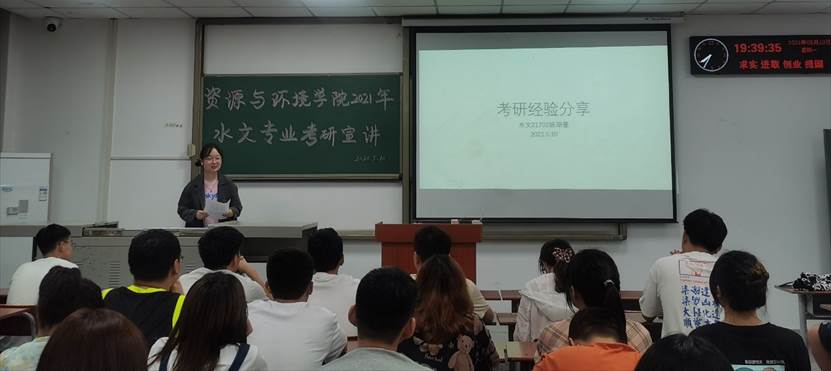 在水文专业的宣讲会上,考研至中国地质大学(武汉)的吴昱同学,向同学们深入解读了自己的考研复习时间节点,并告诫同学们“学习既不能闭门造车,也不能盲目跟风,要有自己的计划,视自己情况而定”,更不可半途而废,“报名了就一定能够要去,万一呢?