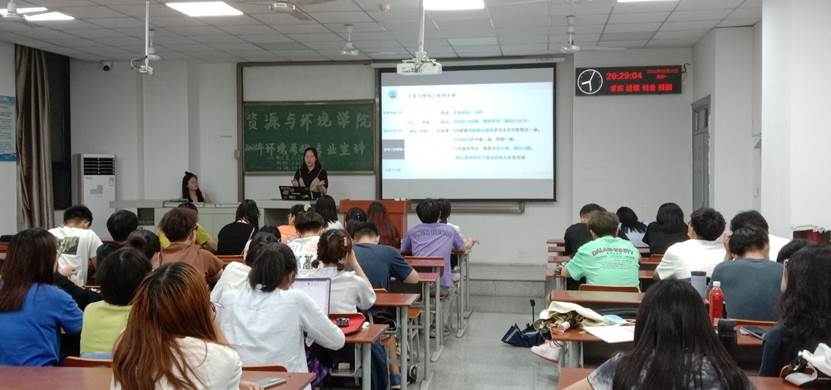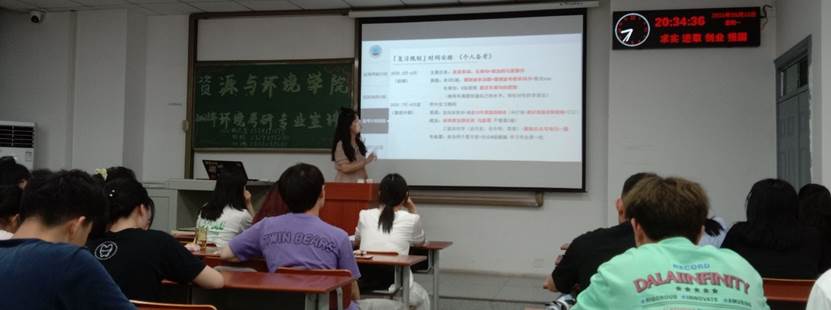 环境专业的考研宣讲在孙琳同学对考研的高度概括中拉开了序幕,“考研和高考有别,考研不单是一场复习备考的持久战,更是一场择校择业择导师的信息战”。既当主持人又当宣讲人的她成功考研至中国地质大学(武汉)。从考研全流程的梳理、考研动机的剖析,到院校、专业信息获取方法的分享,她在不断地举例与数据对比中为大家分析各种选择的利弊,真正做到了面面俱到,有理有据。