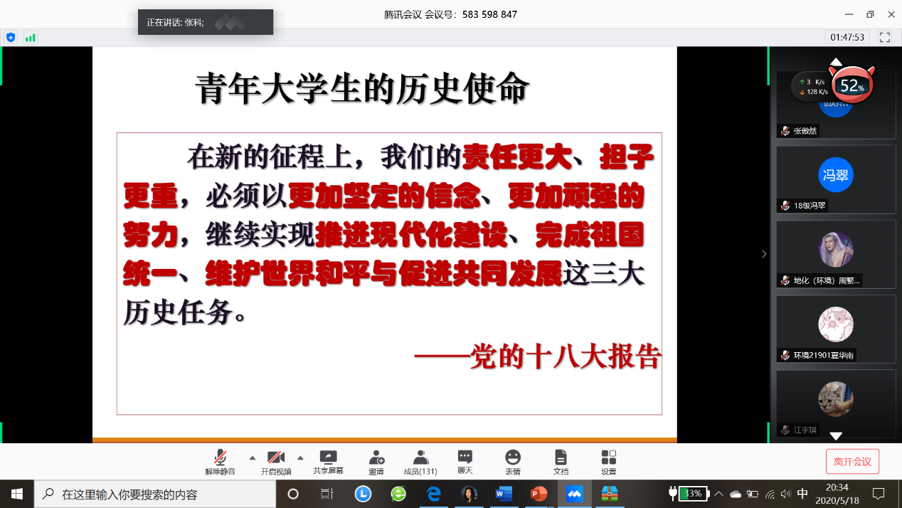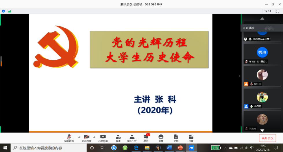 (图/文:吕秀迪)为进一步做好公司党员发展工作,加强对发展对象和入党积极分子的教育和培养,引导其提高思想觉悟,保证发展新党员的质量。太阳成集团tyc122cc于2020年5月18日晚19:00以线上腾讯会议的形式举行了2020年上半年入党积极分子和党员发展对象培训会议。公司党委书记张科主讲,党委副书记范梅英参加、本科员工工作党支部书记李春花主持,共130余名入党积极分子和党员发展对象线上学习。