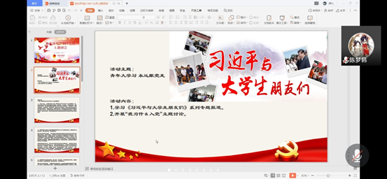 团日活动最后,开展了“我为什么入党”主题讨论。“我为什么入党?”对于每一个已经入党和想要入党的人,这个问题,都是无可回避的灵魂叩问。老一辈革命家之所以入党,是面对那山河破碎、亡国灭种的危局,奔涌出的救国救民的奋争与理想。今天,这个问题将由我们来回答。正值“七一”建党节,各团支部围绕“我为什么入党”开展了一次讨论,引发团员青年对于入党的思考和对入党初心的探索,引导团员青年了解中国共产党历史,做一个热爱祖国、热爱人民、热爱中国共产党的有志青年,积极向党组织靠拢。