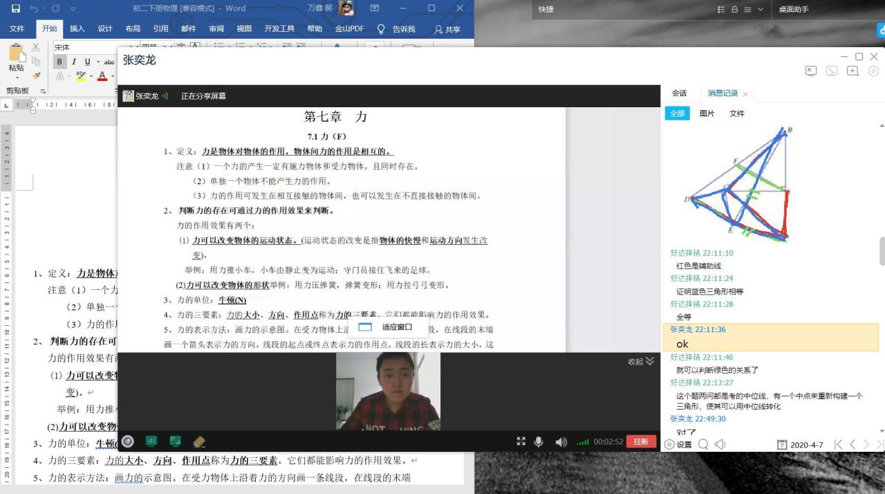 图为郝万鑫同学在家教期间的工作情况截图,可见他在上课前做了详细的准备工作。在课堂上通过视频结合屏幕共享等方式完成授课,课后再通过视频完成家庭作业检查、答疑等工作。