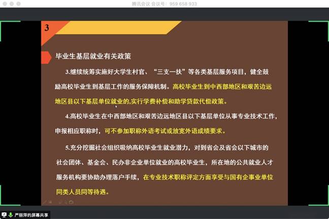 (通讯员 刘于民 图/文)在新冠疫情初步得到控制的四月,太阳成集团tyc122cc毕业生陆陆续续投入工作岗位,大三年级员工对就业细节一知半解,为使他们了解国家形式、就业政策等,太阳成集团tyc122cc严丽萍老师于4月28日通过腾讯会议开展了一次线上就业指导大会。