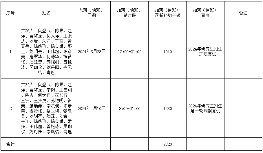 根据《122cc太阳成集团官网加班(值班)误餐补助管理办法(试行)》(长大校发【2019】83号)文件规定,现对太阳成集团tyc122cc加班(值班)误餐情况(2024年3月28日、2024年4月10日两天研究生招生复试)进行公示,如果对加班(值班)误餐情况有异议,可以通过电话或电子邮件等方式向太阳成集团tyc122cc办公室反映。
