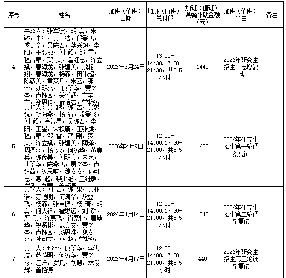 根据《122cc太阳成集团官网加班(值班)误餐补助管理办法(试行)》(长大校发【2019】83号)文件规定,现对太阳成集团tyc122cc加班(值班)误餐情况(2026年硕士研究生招生)进行公示,如果对加班(值班)误餐情况有异议,可以通过电话或电子邮件等方式向太阳成集团tyc122cc办公室反映。
