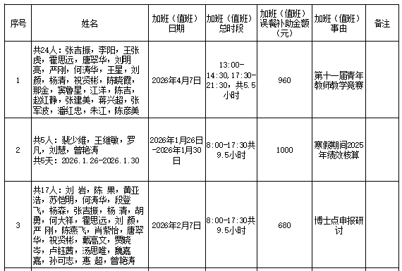 根据《122cc太阳成集团官网加班(值班)误餐补助管理办法(试行)》(长大校发【2019】83号)文件规定,现对太阳成集团tyc122cc加班(值班)误餐情况(2026年1月26日-2024年4月17日之间的青教赛/博士点申报)进行公示,如果对加班(值班)误餐情况有异议,可以通过电话或电子邮件等方式向太阳成集团tyc122cc办公室反映。